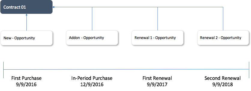 - Each Renewal has its own Contract, but all transactions within a subscription Period are tied with one contract